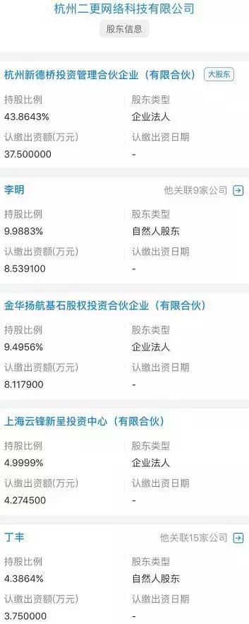 根据工商资料,李明在二更中持股约9.99%,丁丰持股4.39%,公司大股东为杭州新德桥投资管理合伙企业,持股比例43.86%,但该企业的控股股东就是丁丰。