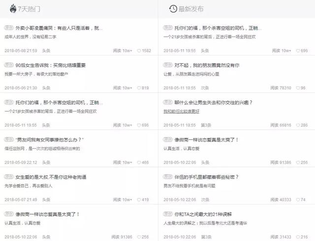 虽然两个公号有一些互补或者共同点,但在内容调性上却完全不一样。一个专注人文、短视频,一个专注女性情感内容。一方面,两个产品的调性越来越远。