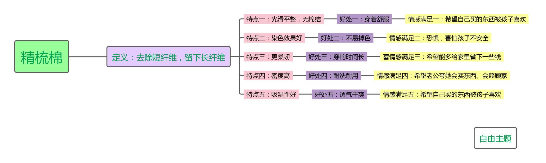 思维导图的第二层是对卖点的解释:去除短纤维,留下长纤维,这时候产品优势更加清晰了。