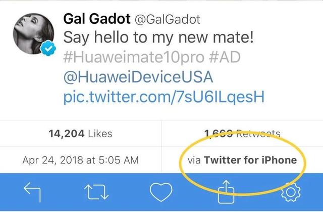 不过最近,女神似乎是膨胀了,当了一回猪队友,在华为代言宣传期中,盖尔加朵在自己的Twitter平台上传了一条 mate 10 pro 的视频广告,但却被知名科技博主 MKBHD 发现,这条推特来自 iPhone 客户端。这就好比加朵在推特宣传《正义联盟》插入了一个灭霸的表情包一样。