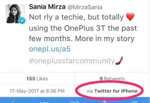 同样在印度,一加也选了一位不怎么样的宣传大使来给自己背书,印度著名网球运动员萨米娅在推特上真情实感的给大家伙安利了一波一加手机,结果诚实的推特显示该条推文来自 iPhone 客户端。