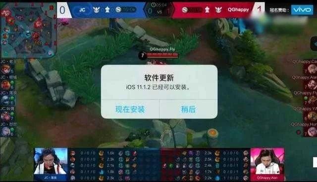 以王者荣耀专门优化为卖点的 VIVO 多次赞助KPL大赛,在产品宣传页中也大肆以王者荣耀赛事专用机作为卖点。但在去年季后赛QG对JC的比赛中,尴尬的一幕出现了,作为专用手机的 VIVO 却弹出了 iOS11.1.2 的更新提示,苹果中国区更新组立功了啊!
