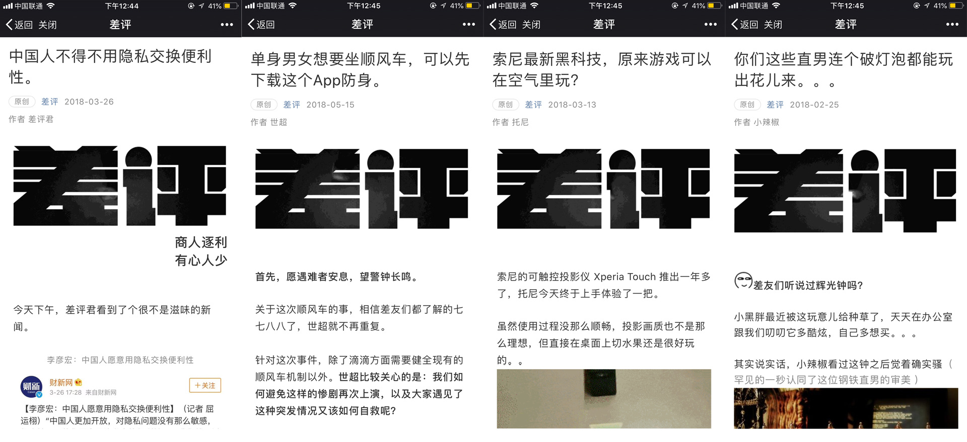 吐槽只是「差评」内容的一小部分。「差评」的微信公众号可以做到日更七条,而每一篇内容都由它旗下的差异性人格化的IP创作。比如,“差评君”就负责以他幽默独道的方式解读互联网新鲜事儿;“小二”是人形种草机,负责发掘市面上最炫最酷的科技产品;“小黑胖”负责“其他大新闻”,汇总互联网行业的今日大事。