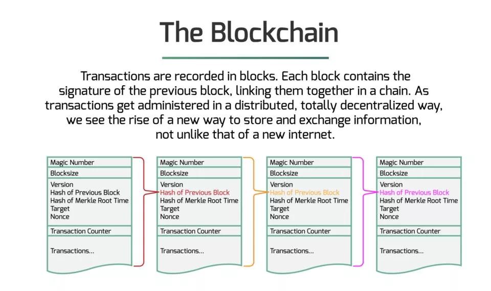 什么是区块链?在区块上记录交易。每一区块包含前一区块的签名,以链的方式将这些区块都连接起来。交易在完全去中心化的分布式账本上纪录,被视为与互联网不同的一种数据存储方式。