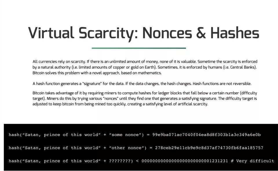 所有货币都依赖于稀缺性,如果无限供应,货币就失去了价值。有时候稀缺性由自然决定:地球上的黄金和铜的储量有限。有时候稀缺性是人为设置的,譬如各国央行。比特币用数学方式神奇的解决了这一问题。