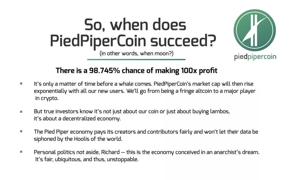 最新上映的《硅谷》第五季第七集中,四位主角之一的程序员 Gilfoyle 试图说服 「魔笛手」公司首席执行官Richard Hendricks 赶快投身加密货币行业。他用精心准备的一套PPT ,来说服这家初创企业进军区块链和加密货币,进行 ICO,可别再土老帽一样地从风险投资那里拿到 B 轮融资。