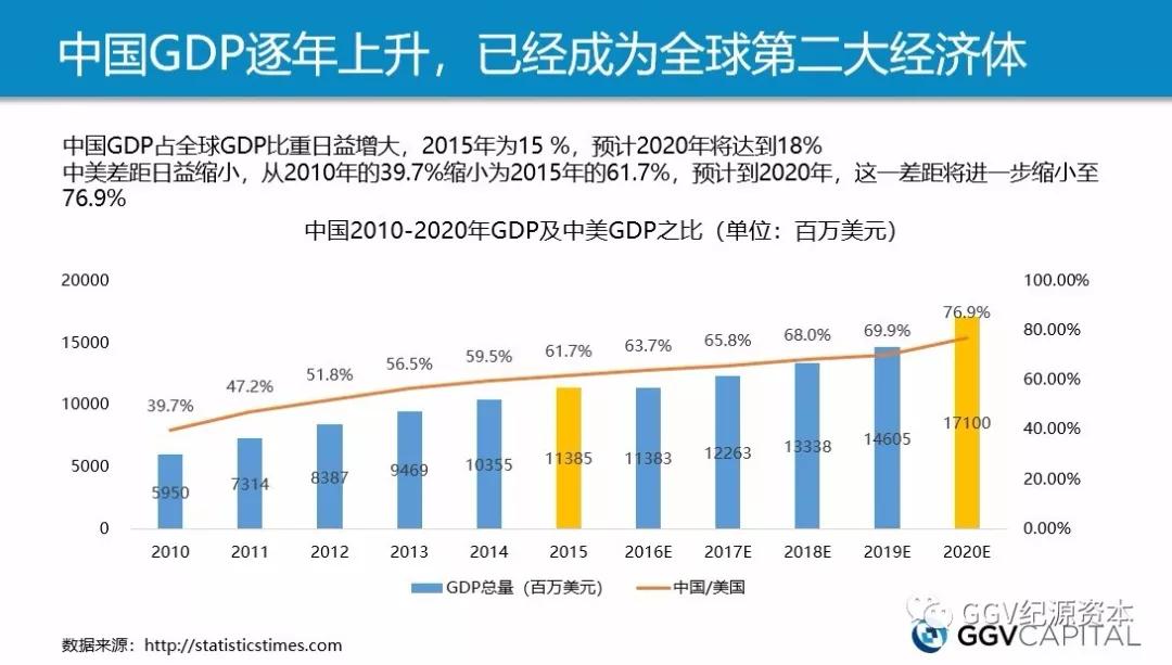 先给大家看张图,从这张图中,大家可以看到,中国GDP占全球GDP的比重在日益增高,2015年是15%,预计2020年将达到18%;同时中美两国GDP的差距也在日益缩小,在2010年时,我们的GDP只有美国的39.7%,在2015年时,我们已经达到美国的61.7%,而未来,在2020年,这一数字将进一步提升至76.9%。这一切都说明中国的国际影响力正在不断增强,作为全球第二大经济体的中国有能力在国际上发挥越来越大的影响力。