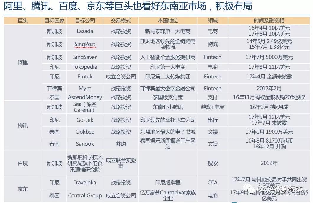 我们也总结了国内巨头出海东南亚的情况,大家可以看到阿里和腾讯也十分重视东南亚市场,早已积极布局。