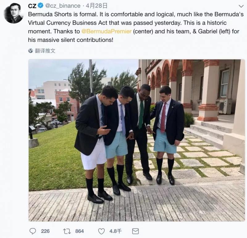 他穿着西装短裤与百慕大总理合影,并且,百慕大刚宣布了积极应对加密货币ICO的法规。
