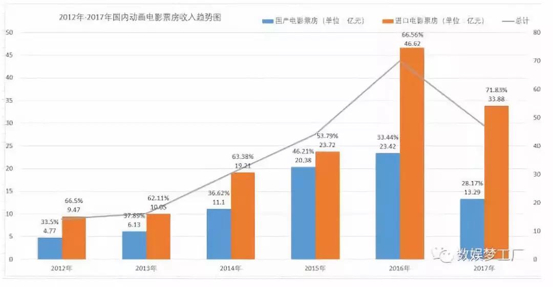 而随着内容供给的缺口逐渐显现,国产新片和爆款影片数量骤减,2017年票房总量首次从高点跌落,同比下滑32.7%至47亿元,进口动画电影重回市场主导地位。