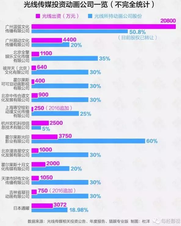 目前光线传媒累计投资的动漫公司有20家左右,覆盖业内大部分主流的独立动漫制作公司。