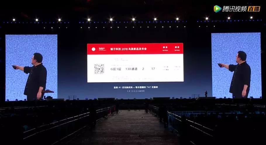 “今天的门票一定要收好,有坚果 R1 的优先购买码,坚果 R1 一定会缺货,不是玩饥饿营销,是真的缺货。优先购买码相当于当作优惠券,前排 1000 元的门票在买 TNT 的时候等价抵消 1000 元。”