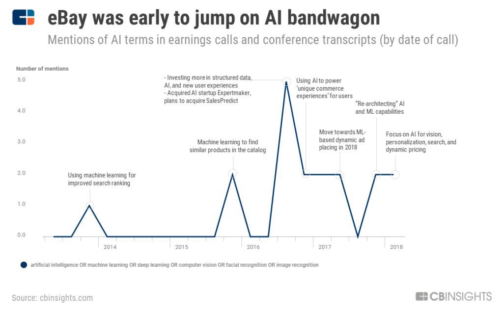 e-Bay是最早开始尝试在线上进行人工智能操作的。该公司在2015年第三季度的财报中开始提及“机器学习”。当时,e-Bay刚刚开始强制卖家输入关于商品信息的描述,并利用机器学习算法来加工数据,找到列表中的相似产品。到2016年第二季度中,人工智能相关技术产品迅速加速,eBay收购了Exoertmaker,并且在2016年第三季度中收购了 Salespredict,在该季度的财报中提到了超过15次的“人工智能”关键词。