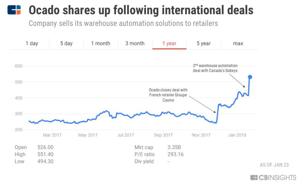 Ocado在2017年第四季度开始与法国零售巨头Casino开始合作,带来了Ocado股票份额的同期快速增长。作为合作协议的一部分,Ocano将为Casino建造一座最新的自动化仓库,同时配套相关的软件部分:比如前后端的网页界面和最后一公里配送规划。这宗交易使得Casino在与家乐福,亚马逊这样传说要进入法国市场的公司相比,技高一筹。2018年,Ocado开始进军北美市场,并与加拿大食品零售商Sobeys开始第二次仓库自动化合作项目。