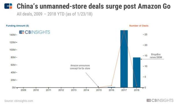 CB insights平台显示,2017年有27总交易涉及无人零售行业。相比之下,在2016年只有一宗,在2016年之前更是闻所未闻。