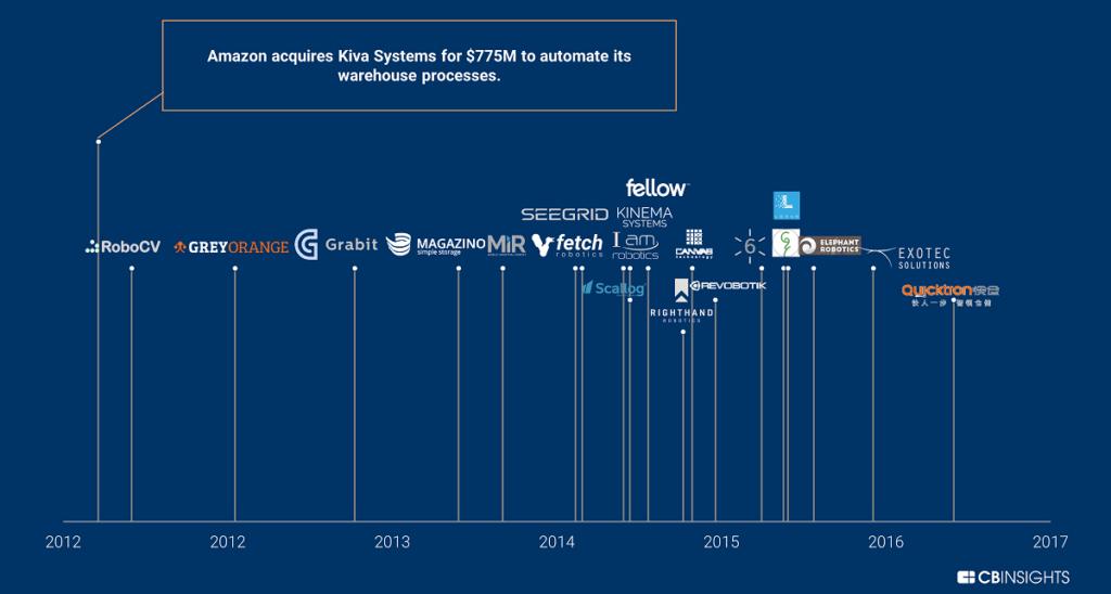 应用CB Insights数据, 我们可以深入挖掘并描绘出零售行业未来的蓝图。在接下来的文章中,我们来一起聊一聊人工智能、机器学习、计算机视觉技术和机器人抓举重物,导航和组装等在产业链从生产制造到产品最终的分配的各个环节中的应用和发展。