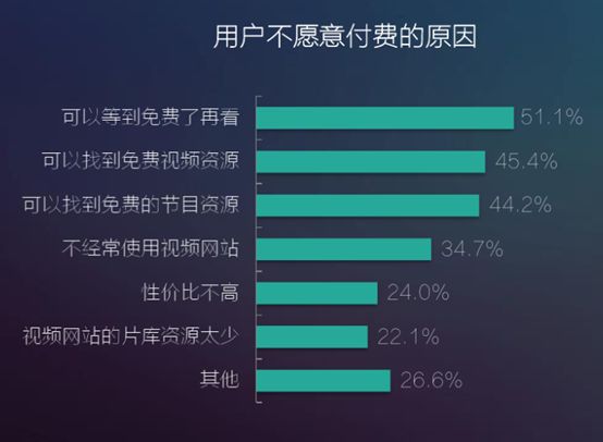 《2017中国网络视听研究发展报告》显示,对于付费视频内容,用户不愿意付费的原因中,有45.4%的用户是因为“可以找到免费视频资源”,有44.2%的用户“可以找到免费的节目资源”。