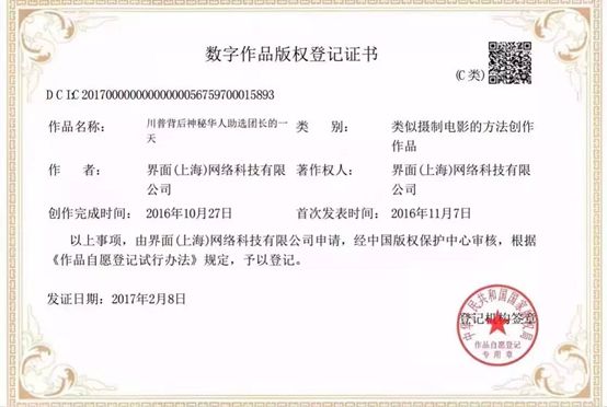 去年2月份,界面新闻旗下的箭厂视频拿到了中国第一份短视频的国家版权登记证书。