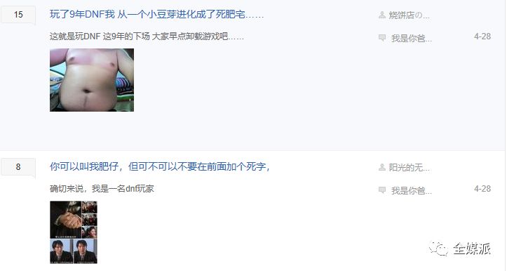百度贴吧中有着“肥宅吧”和“死肥宅吧”,关注人不过千人,发帖数也不过千数。他们不会经常性地进行互动,即使被说成是“只会玩DNF的死肥宅”时,也不会出离愤怒。面对外界的误解和诋毁,肥宅总是能通过自嘲的方式进行化解。