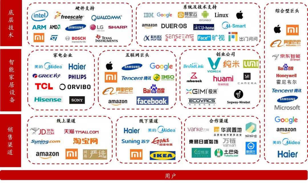 智能家居产业链可以从上中下游分别划分为技术与服务、智能家居厂商与平台、销售渠道与应用场景。