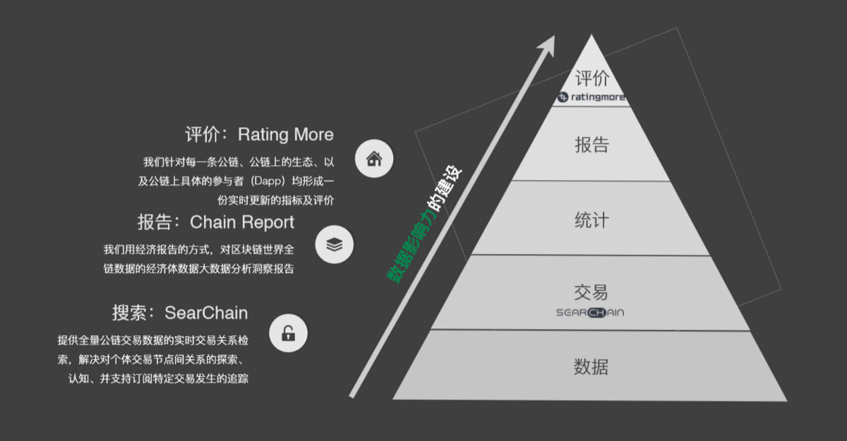 进一步的规划是,SearChain认为,当未来DAPP生态逐步形成之时,可以通过监控某条公链或者某个地址的交易数据,衡量DAPP的活跃程度,以及构建更多客观的指标帮助从业者评价DAPP。