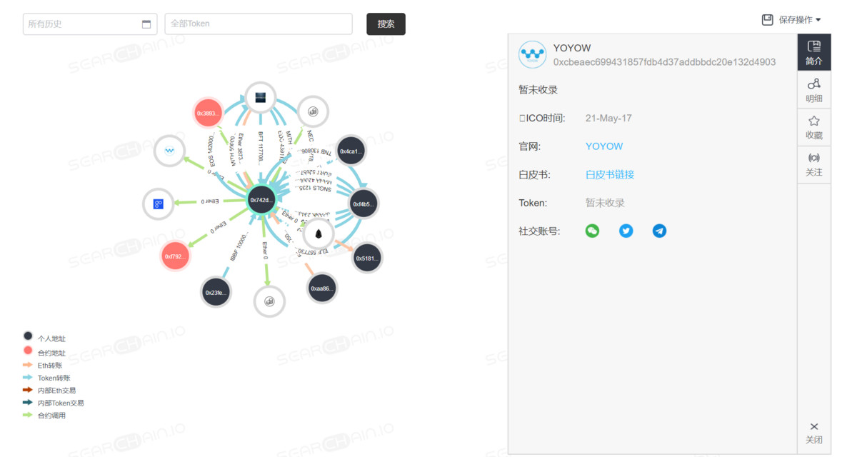 除了为地址定性,交易关系图会尝试呈现不同交易的性质,比如是普通Token专找还是合约调用。如此一来,用户可以较为清晰地查看该账户的总体交易情况。