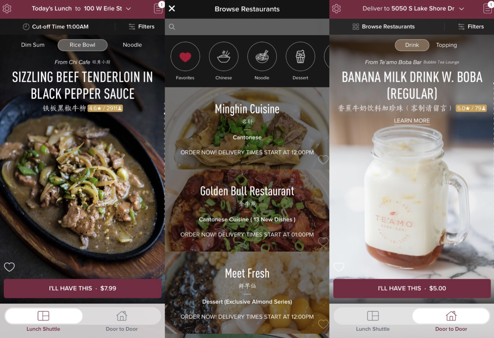 「Chowbus」成立于2015年,APP于2016年3月正式上线。现阶段业务主要在芝加哥和波士顿两个城市。作为订餐平台,目前连接了芝加哥50多家以及波士顿20多家亚洲餐馆,这些餐馆大多是在Grubhub等大型订餐平台无法受到关注的夫妻店。另外,「Chowbus」独特地提供两种订餐模式,用户可以在APP上自行选择。第一种是Shuttle模式,通过送餐车将食品配送到离用户最近的固定取餐点,用户需要自行下楼取餐。第二种是Door-to-Door模式,也就是我们通常的外卖送上门的模式。