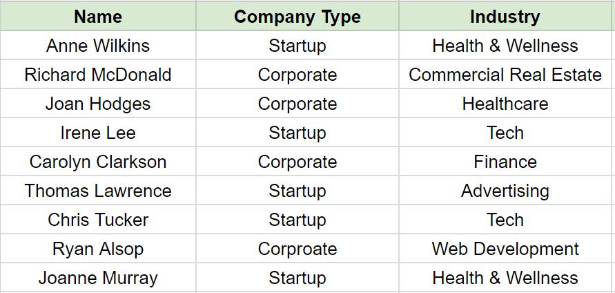 将这些人添加到我为你制作的这个表格中,并且附上他们的公司类型和所在的行业(暂且忽略邮件地址这一栏,之后我们会说到这一点)。