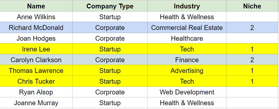 让我们回到之前的电子表格,仔细观察一下我们高亮显示的名字列表。我希望你能够按照这些人帮助你的可能性进行排名,之后从上到下依次进行联系。