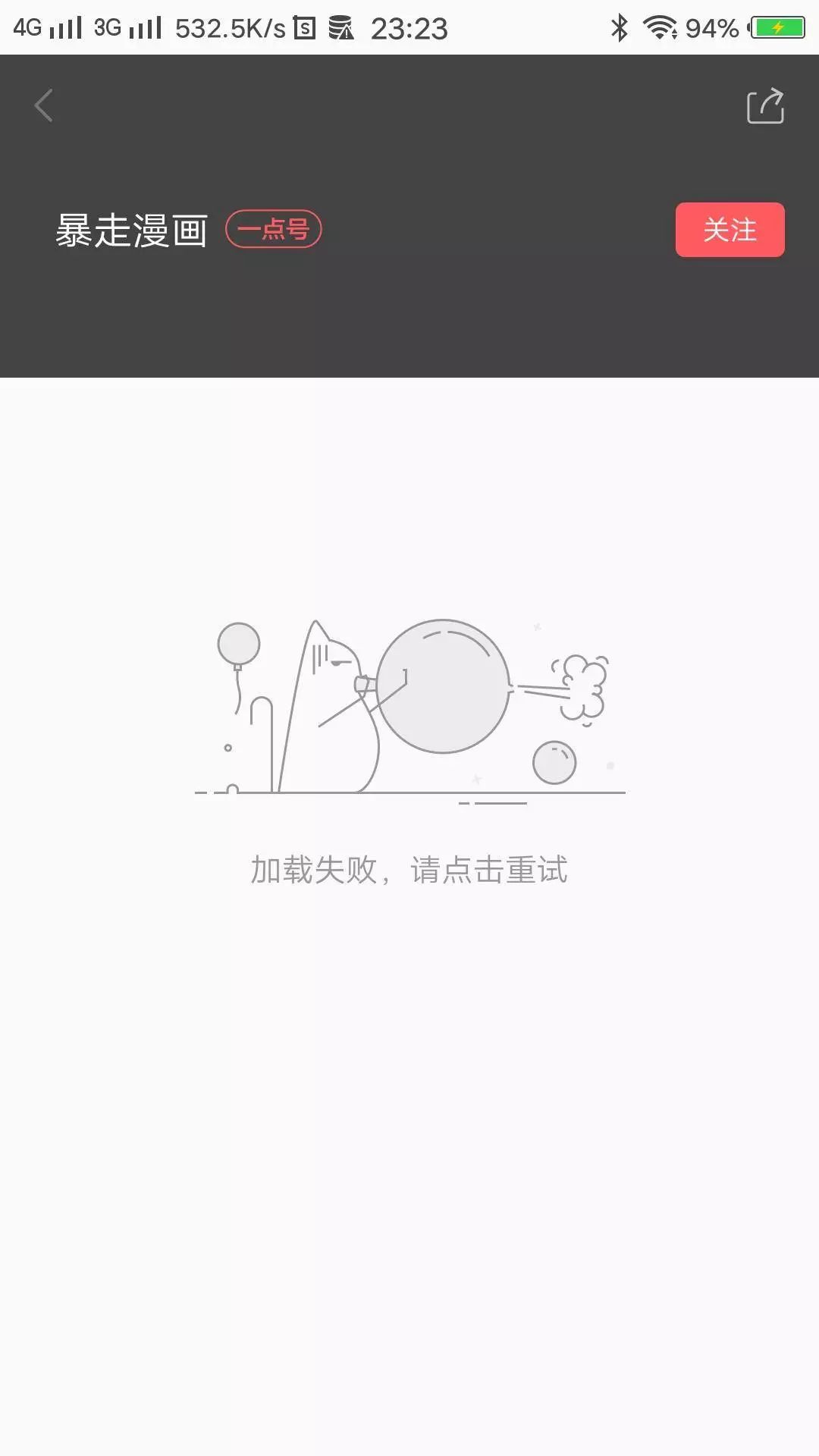 部分平台也选择和“顶风作案”的暴走漫画划清界限。比如,打开一点资讯的“暴走漫画”一点号,显示的是:加载失败,请点击重试。