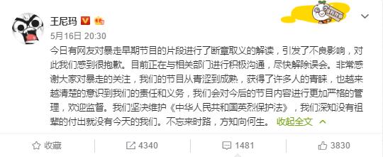 王尼玛表示,“网友对早期节目的片段进行了断章取义的解读,引发了不良影响,对此我们感到很抱歉。目前正在与相关部门进行积极沟通,我们会对今后的节目内容进行更加严格的管理,欢迎监督。我们坚决维护《中华人民共和国英烈保护法》,我们深知没有祖辈的付出就没有今天的我们。”