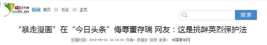 这篇名为《“暴走漫画”在“今日头条”侮辱董存瑞 网友:这是挑衅英烈保护法》的文章是中国青年网5月16日下午16时14分发布的。
