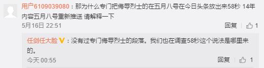 任剑依然在微博上持续发声,0时55分,任剑对质疑进行了回应,“没有过专门侮辱烈士的段落。我们也在调查58秒这个说法是哪里来的。”