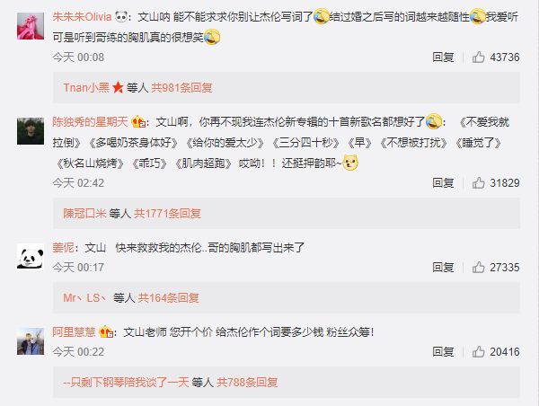 情况好像比之前还严重一些,网友们干脆直接成群结队一起去方文山的微博下面留言了:文山呐,你可救救杰伦吧,别让他再去写歌词了。