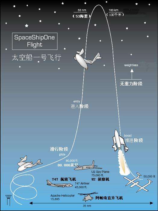 “亚轨道飞行“是指在距地球35到300公里的高空进行飞行。由于未达到绕地飞行速度,所以飞行器相当于在太空中做个抛物线回到地球。