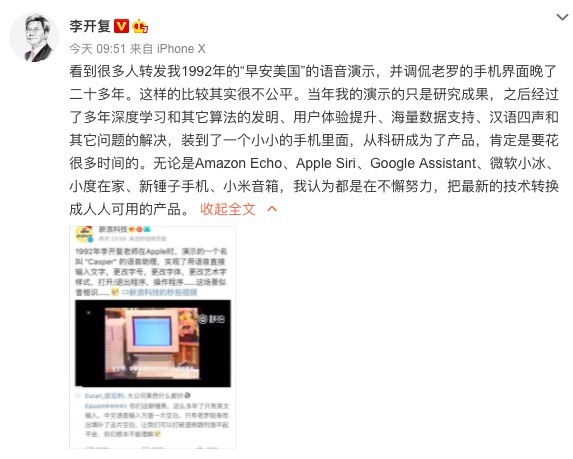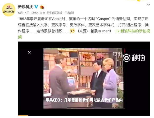 新浪科技官网微博早昨天凌晨发出了一个1992年李开复在苹果时期的语音助理视频,并说道:“这场景似曾相识.....[doge]”,疑似在调侃一天前在鸟巢发布会上演示语音助理的罗永浩。