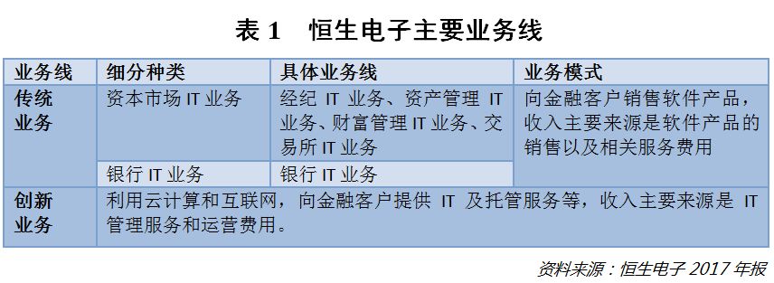 恒生电子成立于1995年2月,2003年在上交所上市,主营业务为软件产品、服务及金融数据业务,客户遍及各类金融机构。其财报信息显示,公司产品线齐全、市场占有率高,属于名符其实的金融IT龙头(参见表1)。