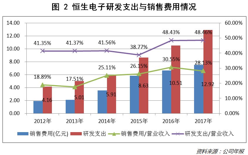 再看另一个指标,2014年,恒生电子的销售费用占比有了明显提升,从17.51%提高至25.11%,之后便一直处于30%左右的高位。