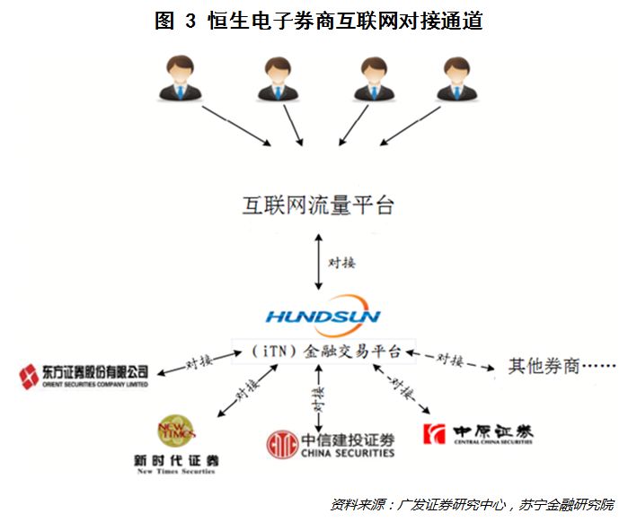 以恒生iTN交易平台为例,其“以互联网交易通道为核心,搭载行情、资讯、开户、仿真、策略、配资等大量金融服务,以开放各类接口和协议的方式引入终端用户、金融机构、互联网公司以及各类开发者”。