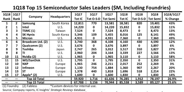 而最近市场研究公司IC Insights刚刚公布的第一季度统计报告也显示了三星在芯片销售方面的领先优势。