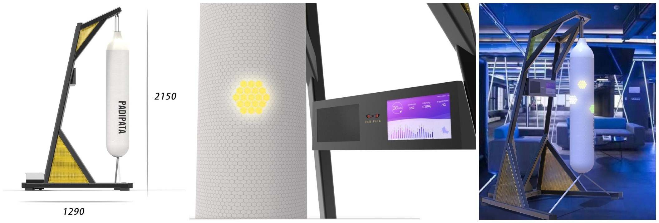 36氪近期了解的「30MIN」于今年5月推出了第一款智能沙袋 Padipata IPB-XL,这款沙袋高2.15米,后端有十寸高清显示屏,能够及时反馈用户击打数据,并搭载有氧训练模式、娱乐模式与在线PK模式,满足用户健身与娱乐的双重属性。整体支架采用分体式安装,能够保证击打的稳定性。值得一提的是,Padipata 智能沙袋内部镶嵌了一块可发光的交互屏,在不同模式下,交互屏会通过大小、形状不同的光斑指引用户以不同的节奏与力度击打相应的位置,类似跳舞机以低门槛的娱乐化方式达到健身训练的目的。