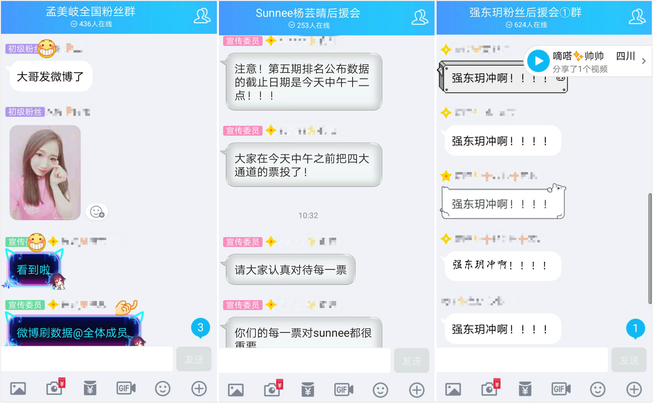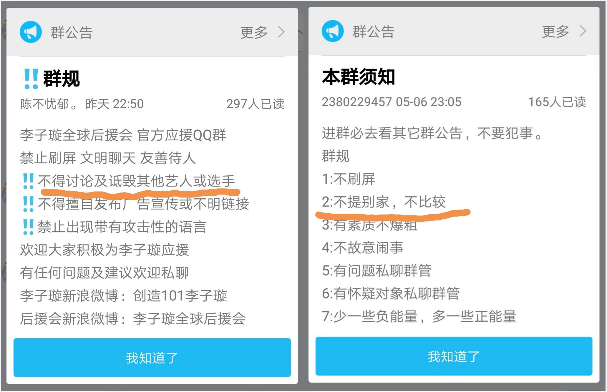 群公告反复强调「不讨论其他选手,关注自家」,管理员也会偶尔出现,解释称这是为了避免黑粉截图引战。饭圈用拼音缩写代替人名的晦涩习惯也是来源于此。