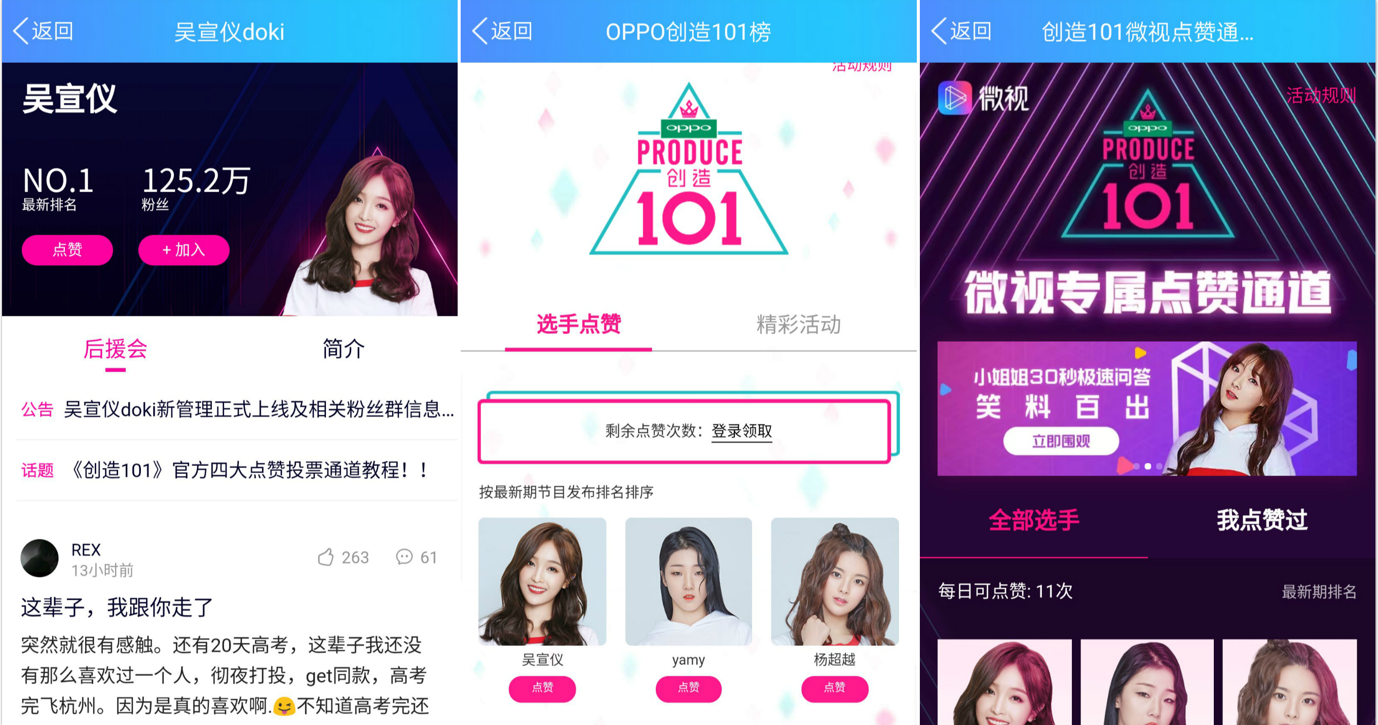 腾讯视频、微博、OPPO 和微视的点赞页面被称为「四大通道」,是最主要的投票平台。这些票数会直接影响小姐姐在《创造 101》里的顺位排名,是决定去留与生死的关键,各家粉丝群都不会轻视。