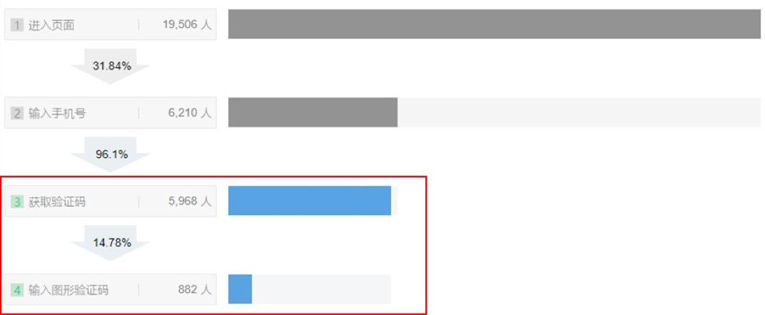 例如:4月12日发现输入图形验证码这一步转化率在有明显异常,于是紧急通知技术同事排查,发现图形验证码功能失效,导致大量用户无法显示。紧急修复后,转化率回到之前的水平。所以,通过对每一步漏斗转化率的监控分析,可以及时发现问题,及时止损。