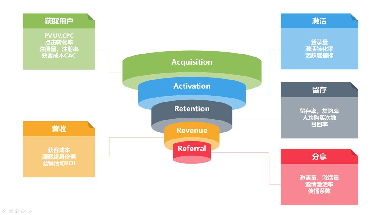 AARRR模型是一套适用于移动App的分析框架,又称海盗指标,是“增长黑客”中驱动用户增长的核心模型。AARRR模型把用户行为指标分为了5大类,分别为:获取用户,激发活跃,提高留存,增加收入和病毒传播。