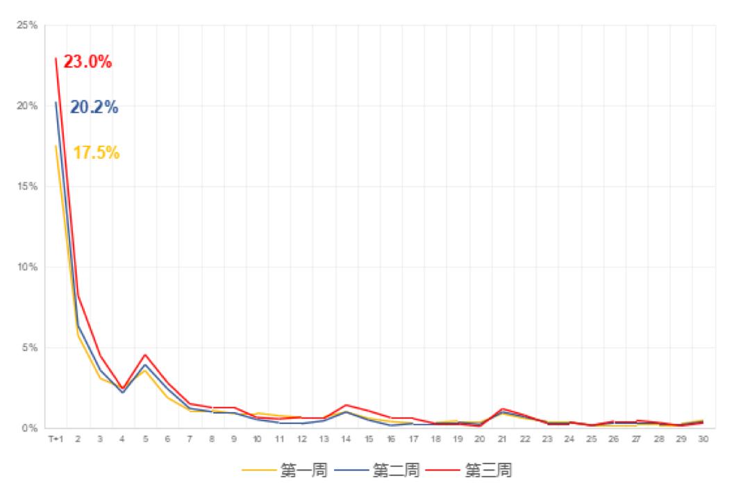 然后根据客户注册的时间按周进行分组,得到同期群,制作留存曲线图,观察该群体用户发生购买的 30日留存。通过比较不同的同期群,可以获知新用户购买率指标是否在提升。