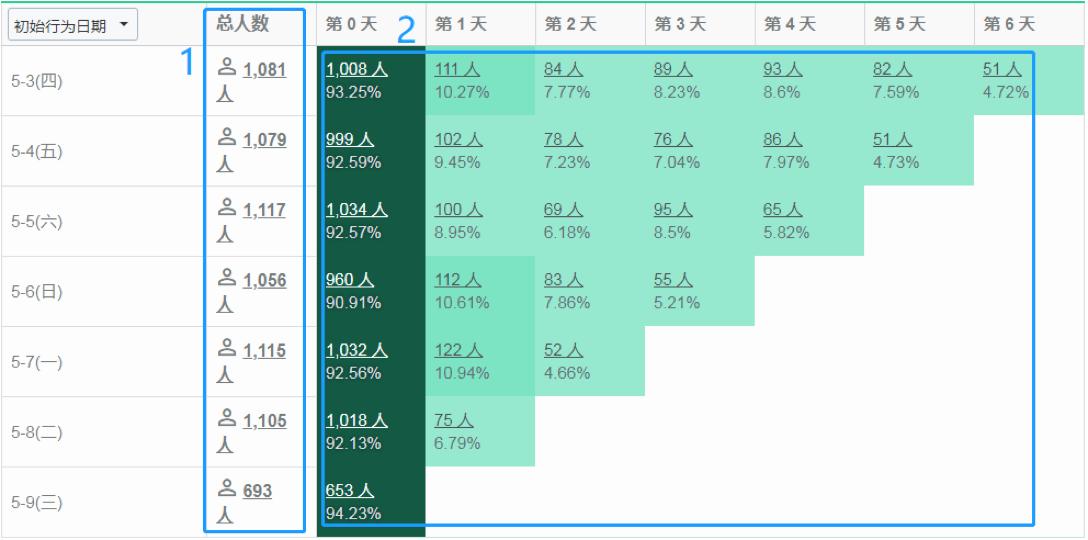 留存表:留存表中给出了目标用户的留存详情,主要包括以下几个信息: