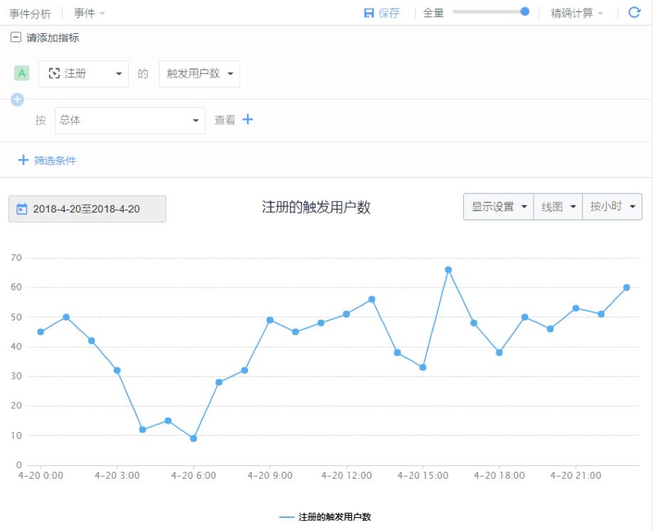 事件:通过埋点,高效追踪用户行为或业务的过程。注册、启动、登录、点击等,都是常见的事件。例如下图,通过“神策分析"展示出某日的注册事件。