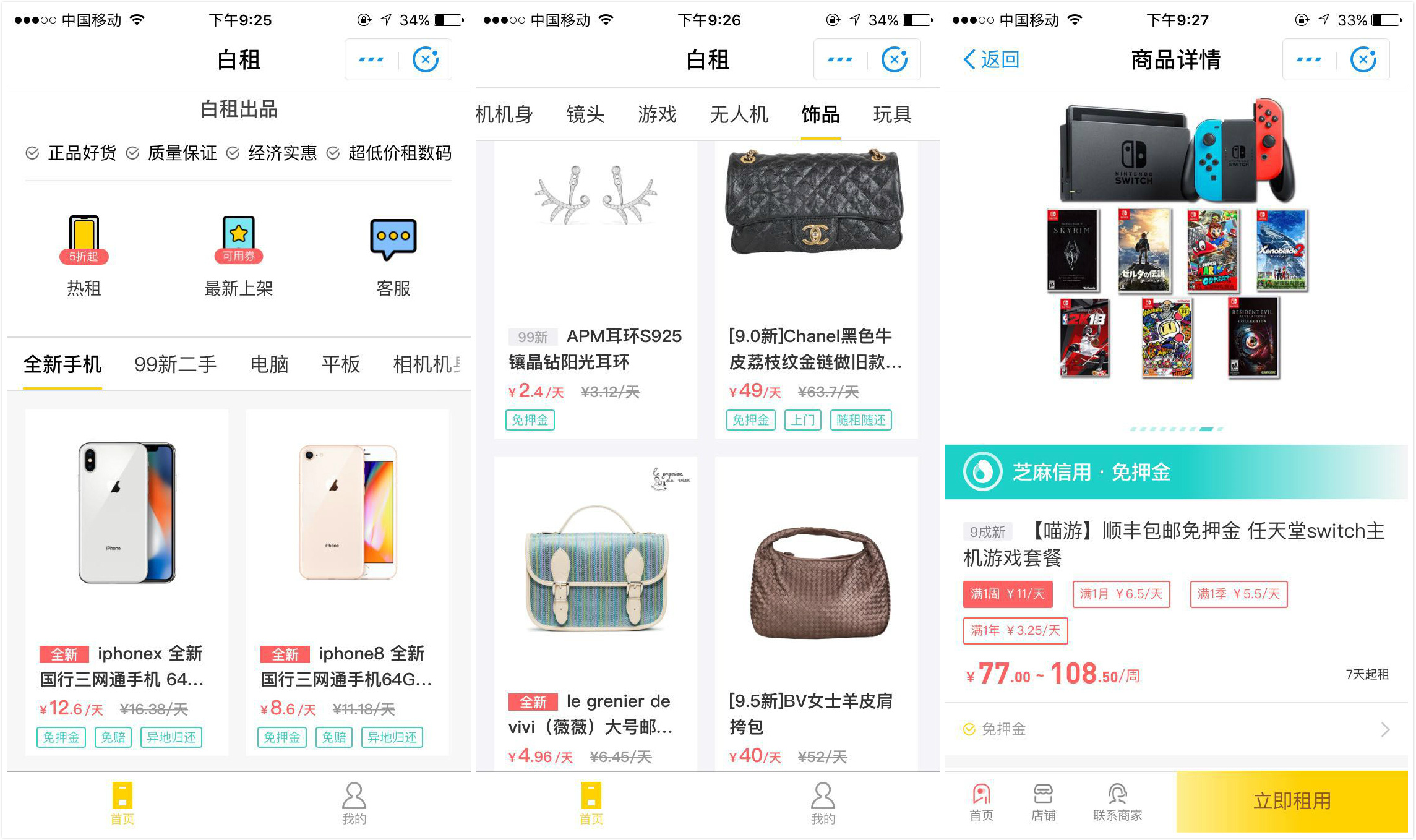 2017年成立的「白租」定位为全品类租赁平台,马雷认为:未来租赁将成为商家必要的经营方式之一,当出现了足够多的租赁部门,应该有一个平台为商家提供流量、风控、软件、金融支持;另一方面,对消费者来说,每租一类产品都要进入新的平台,缺少一个综合性入口,以及品质筛选、售后维护的第三方平台。