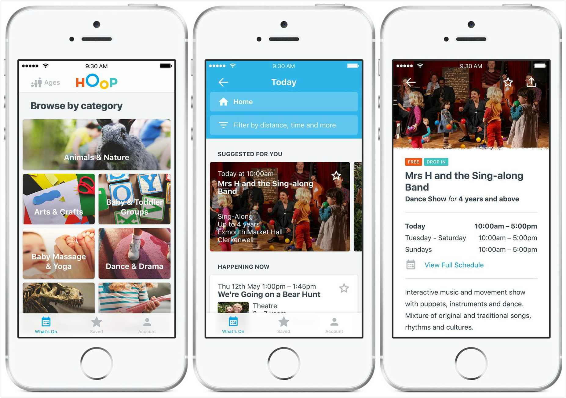 2016 年,Hoop 在伦敦上线,提供手机 App 帮助家庭预订本地的儿童活动,包含体育运动、戏剧课程、手工 DIY 活动等。推出以来,应用下载次数超过 75 万次,每月会推荐八万多个本地活动,服务范围已覆盖到英国全境。